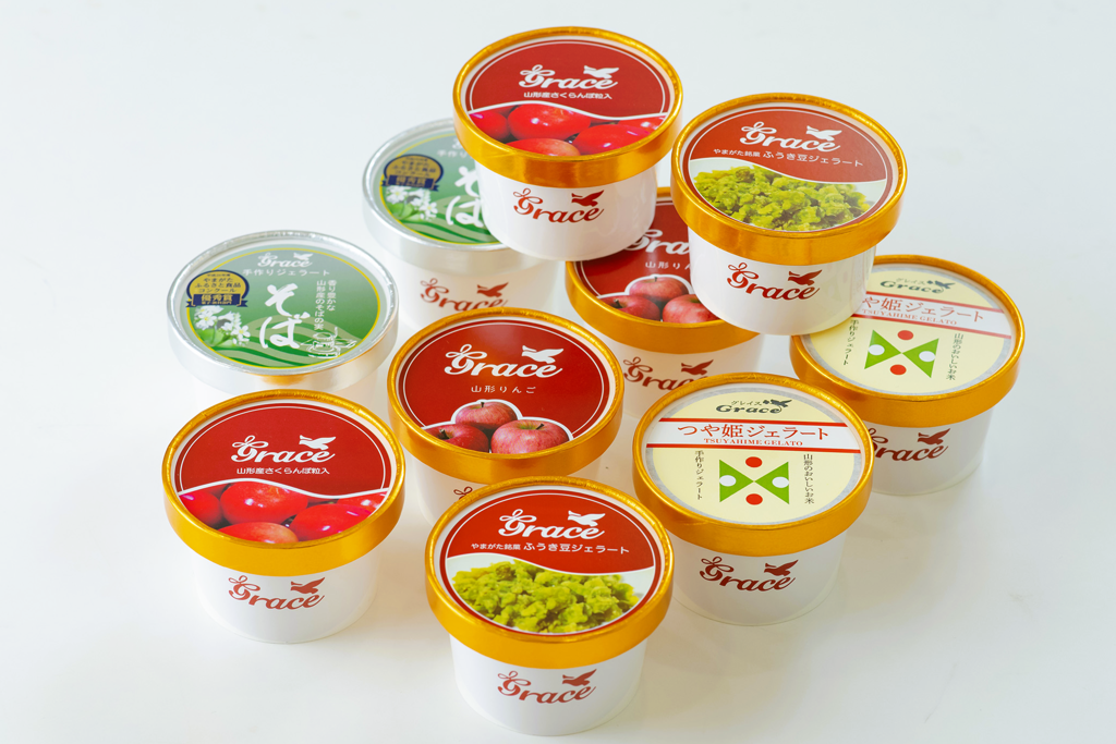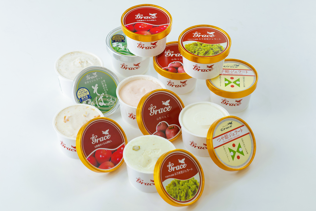 ・山形県産さくらんぼジェラート 牛乳(国内製造)、さくらんぼ(山形県産)、乳製品、砂糖、水飴、リキュール、レモン果汁/トレハロース、乳化剤、安定剤(増粘多糖類)、酸化防止剤(V.C)(一部に乳成分を含む) ・山形県産米つや姫ジェラート 牛乳(国内製造)、乳製品、砂糖、水飴、米(山形県産)/トレハロース、乳化剤、安定剤(増粘多糖類)、(一部に乳成分を含む) ・山形県産秘伝豆ずんだジェラート 牛乳(国内製造)、水飴、乳製品、砂糖、大豆(山形県産)、枝豆(山形県産)/トレハロース、乳化剤、安定剤(増粘多糖類)、(一部に乳成分・大豆を含む) ・山形県産ラ・フランスシャーベット ラ・フランス(山形県産)、砂糖、水飴、ラ・フランスパウダー(ラ・フラスンス、砂糖)、レモン果汁/トレハロース、安定剤、環状オリゴ糖、酸化防止剤(V.C)、香料(一部に大豆を含む) ・山形県産紅玉りんごシャーベット 紅玉りんご(山形県産)、牛乳(国内製造)、乳製品、砂糖、水飴、レモン果汁/トレハロース、乳化剤、安定剤(増粘多糖類)、酸化防止剤(V.C)、(一部に乳製品・大豆・りんごを含む |