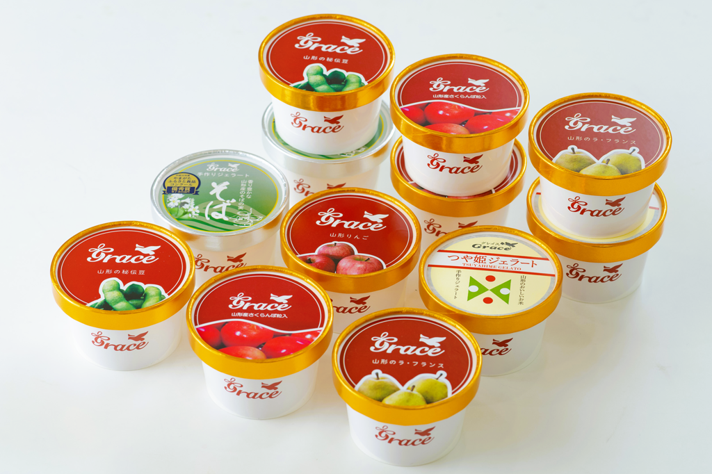 ・山形県産さくらんぼジェラート 牛乳(国内製造)、さくらんぼ(山形県産)、乳製品、砂糖、水飴、リキュール、レモン果汁/トレハロース、乳化剤、安定剤(増粘多糖類)、酸化防止剤(V.C)(一部に乳成分を含む) ・山形県産米つや姫ジェラート 牛乳(国内製造)、乳製品、砂糖、水飴、米(山形県産)/トレハロース、乳化剤、安定剤(増粘多糖類)、(一部に乳成分を含む) ・山形県産秘伝豆ずんだジェラート 牛乳(国内製造)、水飴、乳製品、砂糖、大豆(山形県産)、枝豆(山形県産)/トレハロース、乳化剤、安定剤(増粘多糖類)、(一部に乳成分・大豆を含む) ・山形県産そばジェラート そば(山形県産)/トレハロース、乳化剤、安定剤(増粘多糖類)、(一部に乳成分・蕎麦を含む) ・山形県産ラ・フランスシャーベット ラ・フランス(山形県産)、砂糖、水飴、ラ・フランスパウダー(ラ・フラスンス、砂糖)、レモン果汁/トレハロース、安定剤、環状オリゴ糖、酸化防止剤(V.C)、香料(一部に大豆を含む) ・山形県産紅玉りんごシャーベット 紅玉りんご(山形県産)、牛乳(国内製造)、乳製品、砂糖、水飴、レモン果汁/トレハロース、乳化剤、安定剤(増粘多糖類)、酸化防止剤(V.C)、(一部に乳製品・大豆・りんごを含む) |